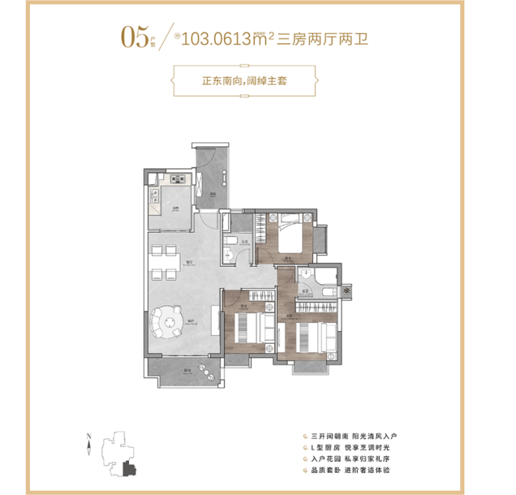 最大的在售户型是 103㎡的 3 室 2 厅,总价在 336 万到 450 万元之间,不同楼层和朝向价格差异较大,这个户型的客厅面宽更宽,阳台也更大,部分房源能看到远处的街景,适合有老人同住的家庭。