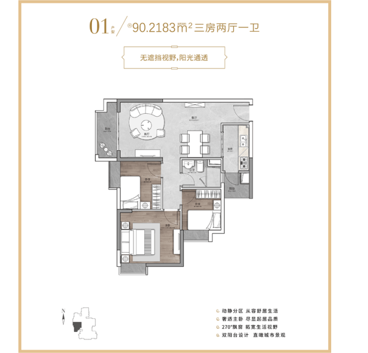 三口之家可以看看 90㎡的 3 室 2 厅,总价约 328 万元,布局很规整,厨房是 U 型设计,预留了冰箱位置,次卧面积刚好能放下儿童床,公卫做了干湿分离,日常使用互不干扰。