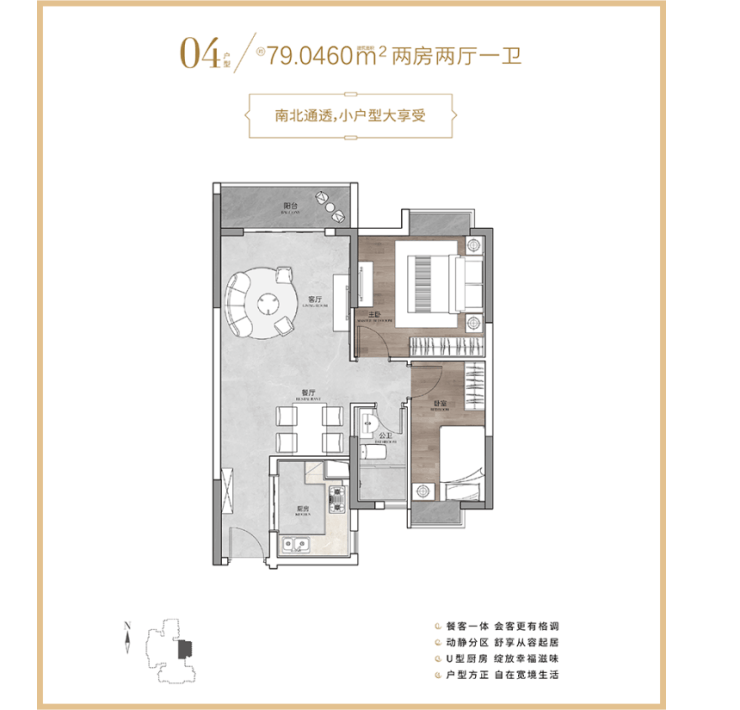 79㎡的 2 室 1 厅是刚需热门,总价大概 300 万元,得房率能到 82%,主卧带 270° 转角飘窗,采光不错,南向的朝向也让房间冬天更暖和,客厅和卧室的空间分配比较均衡,不会显得局促。