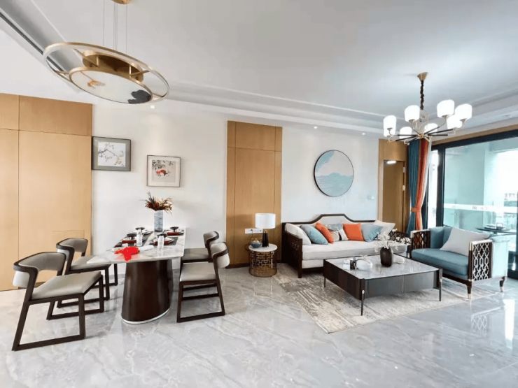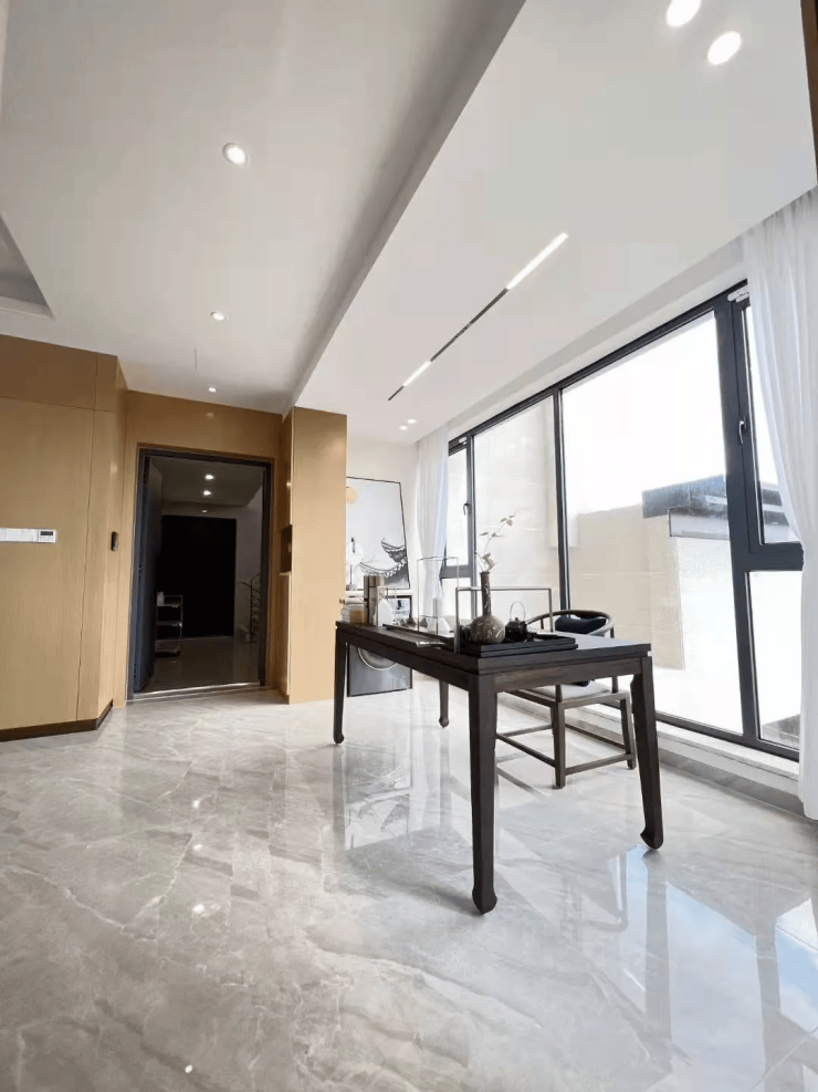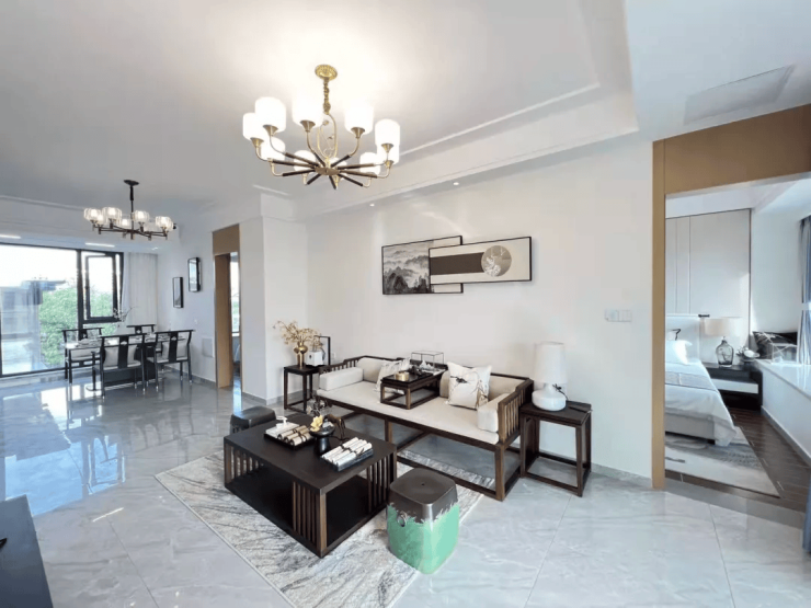 实景图:建筑风格采用新中式风格,外立面干挂石材,铝单板与真实漆相结合,贵显大气稳重