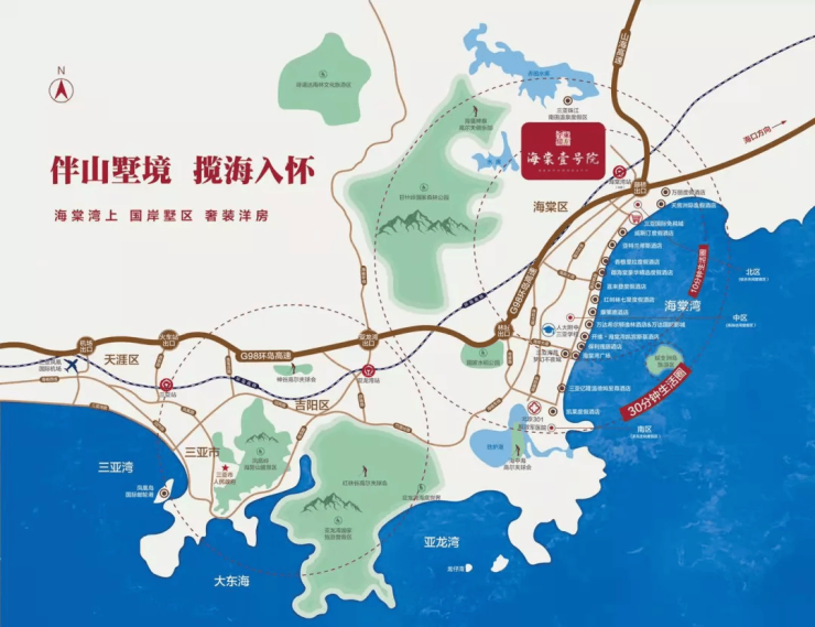 区位:海棠壹号院坐落在三亚海棠湾南田温泉度假区,北接赤田水库(三亚生活饮用水源),西靠麒麟山,背山面海,福泽之地。