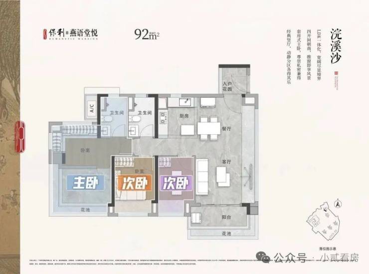 抢手的约90㎡横厅三房,客餐厅(含飘窗)开间约6米,主卧带270度飘窗。
