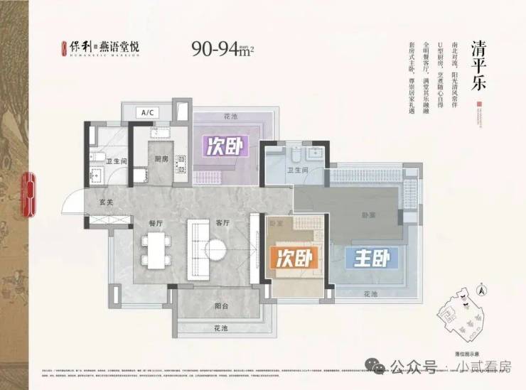 户型有90-94平横厅三房两卫,92平三房两卫,107-112平四房两卫,125平四房两卫