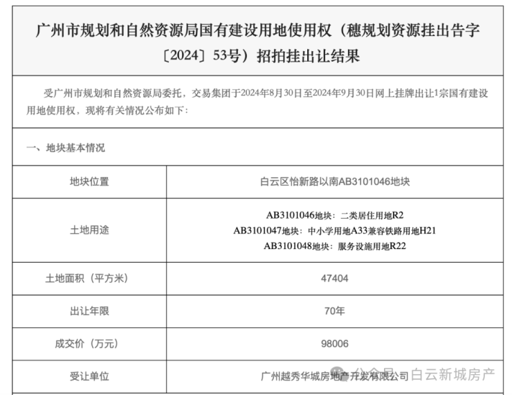 公开资料显示,上述地块白云区怡新路以南AB3101046地块,在今年9月30日经过24轮竞价,由越秀地产以9.8亿拿下,折合楼面价2.99万/m²。