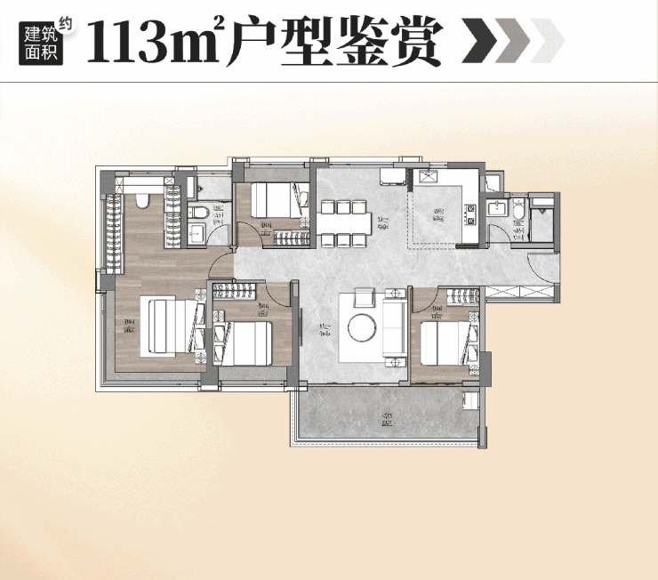 113㎡四房两卫,堪称保利珠江天悦的平替,是西部最小的望江四房。四开间朝南,南北对流,南向超大阳台,样板间展现出上一代产品 130㎡的尺度感,LDKB一体化设计,会客空间宽敞。