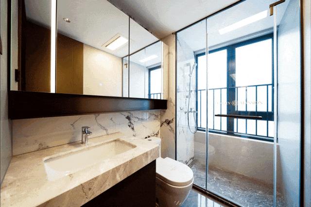 更贴心的,是藏在主卫镜柜后面的美妆冰箱,女主人早晚护肤,不用再跑去厨房拿面膜。