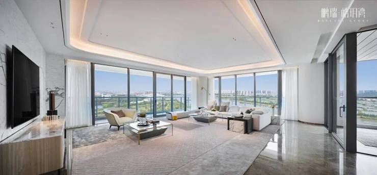 以阿扎姆号游艇的弧线为灵感,打造约28米长景观阳台,搭配约270度IMAX环幕采光面,将窗前约5公里的滨水长廊及磅礴江景,轻松投入眼帘。