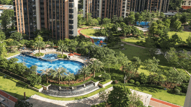 项目拥有约10万㎡社区园林,其中包括5.2万㎡中央花园、近600㎡泳池及超2500㎡全龄游乐园等设施。