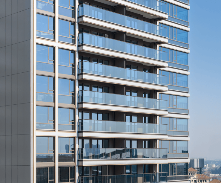 建筑立面以现代简约的玻璃与铝板,勾勒出鎏光镜面的挺拔轮廓。细节处,则从广府「满洲窗」与「叠山纹」中提炼弧线元素,让建筑兼具国际风范与在地文脉。