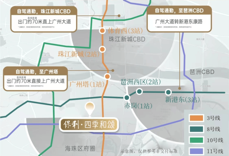 项目占据城市最核心的位置,左拥海珠成熟老城,右抱琶洲数字经济区,项目途径广州大道南,到珠江新城只需5公里,到琶洲只需11公里,顶尖的资源及产业都沿着这条中轴铺开。