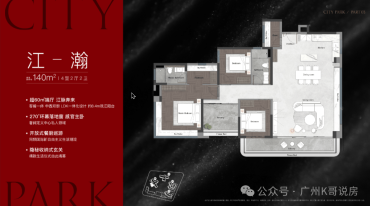 该栋为25层高,两梯三户设计,只有两个面积段,120㎡和140㎡,户型做得不错,在景观展现上用了功,极大程度去放大观江面,比方说超宽阳台、L型主卧转角飘窗、客厅预留观景飘窗等等,主打改善户型,2025年9月整体交房。