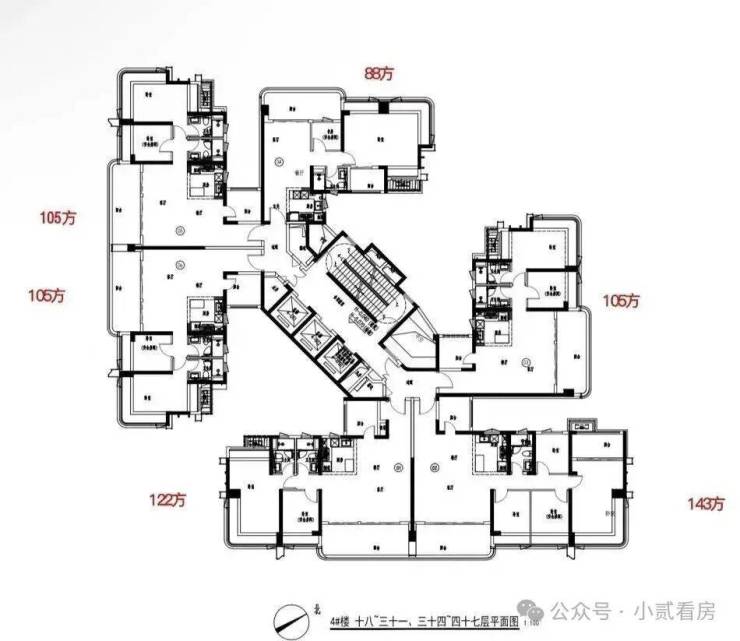 6个户型,朝向分别为:88平朝西北,2个105平朝西南,122平和143平朝东南,还有一个105平朝东北,不分户型大小,全都是3.05米层高