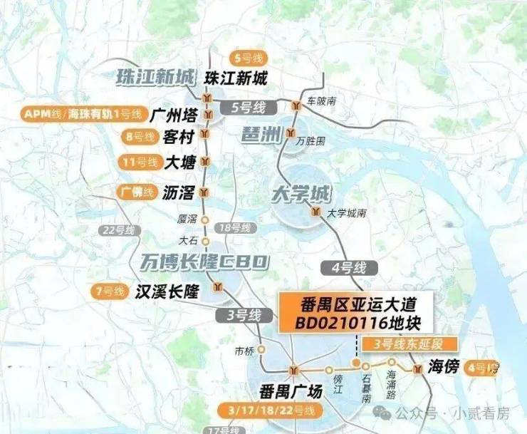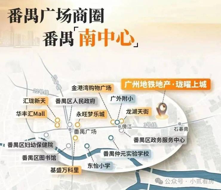 1站之外的傍江站,龙湖天街已经在建;2站到番禺广场,有永旺梦乐城、百德商业中心等商业。