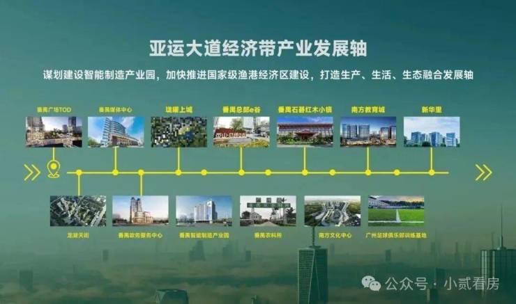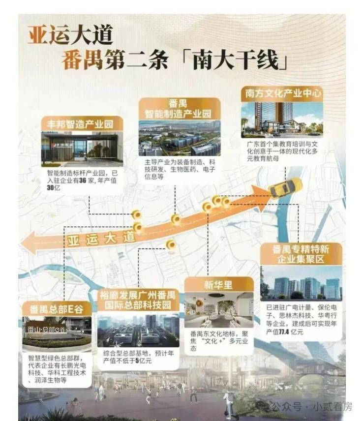 值得注意的是,以番禺广场商圈为起点,连通到莲花湾汽车产业带,“第二条南大干线”千亿产业轴已在酝酿。亚运大道沿线,密布番禺总部E谷、智能制造产业园、丰邦智造产业园等节点,这里将是番禺的“智核”所在,也是番禺未来所在。