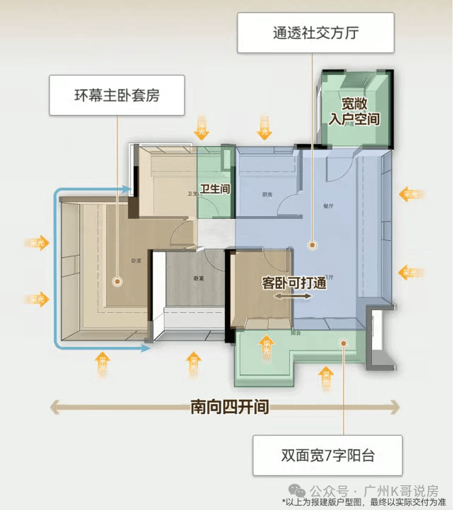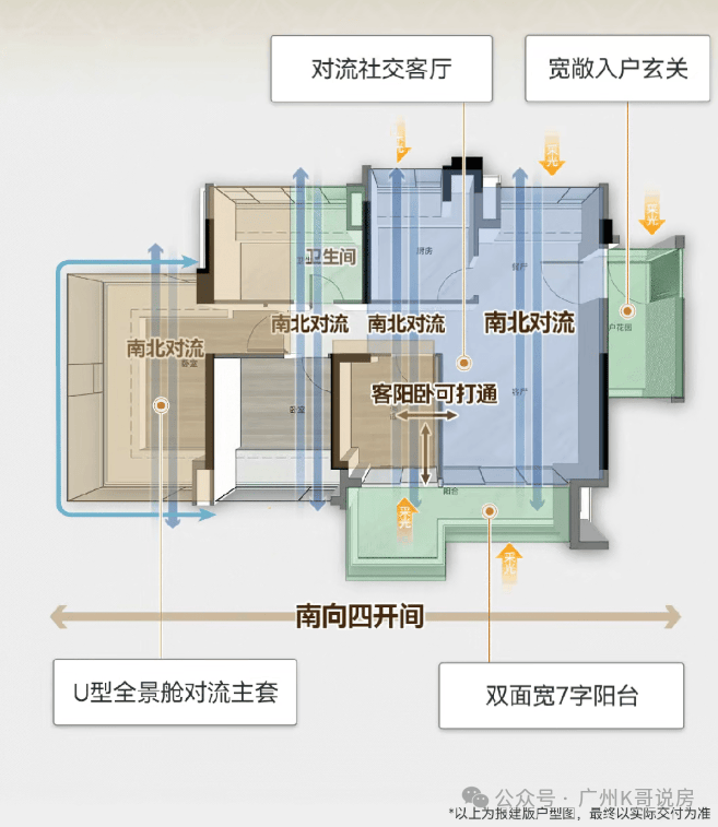 客餐厅、主卧套间是真正的南北对流,不是伪对流,还有超长阳台,实用满分。