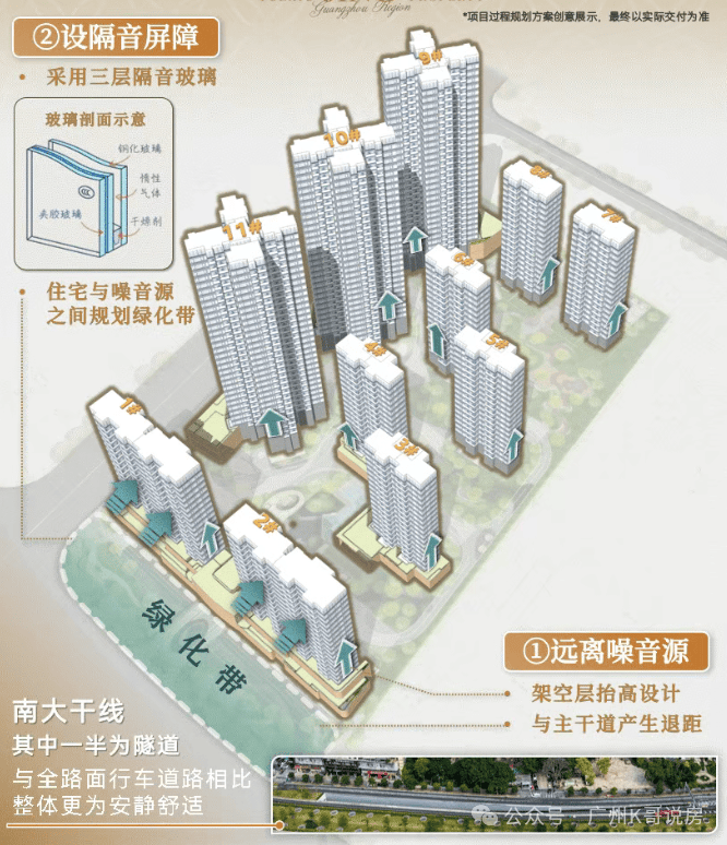 项目在临近南大干线区域,规划了约2500㎡防护绿地,相当于天然隔音屏障。