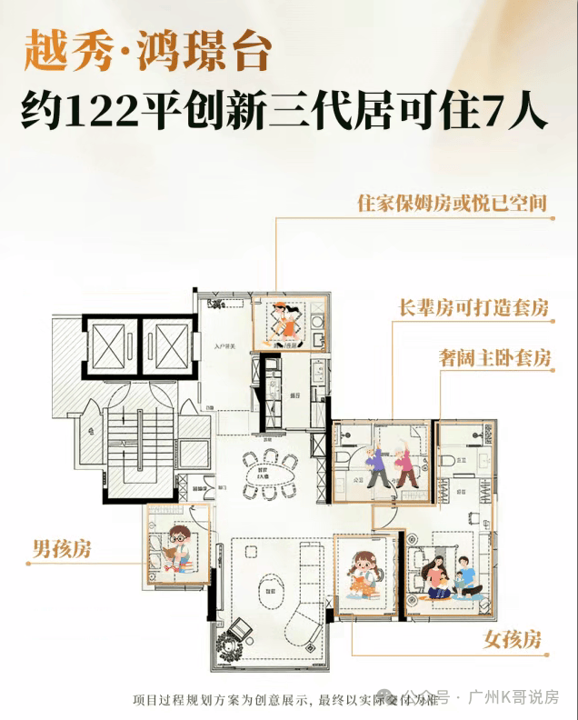 面积做到5个房间,能容纳三代同堂和住家保姆的7人三代居,以往是没有的,实现了代际突破。