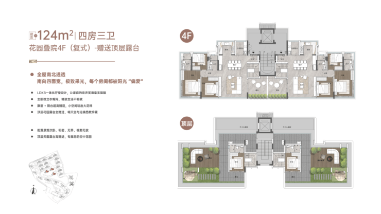 “玥境”为滨江小洋楼,主打112-124㎡低密叠院,最大亮点是超高赠送率,1F、2F户型赠送私属花园,3F赠送超大景观露台,4F复式设计,赠送顶层天台。