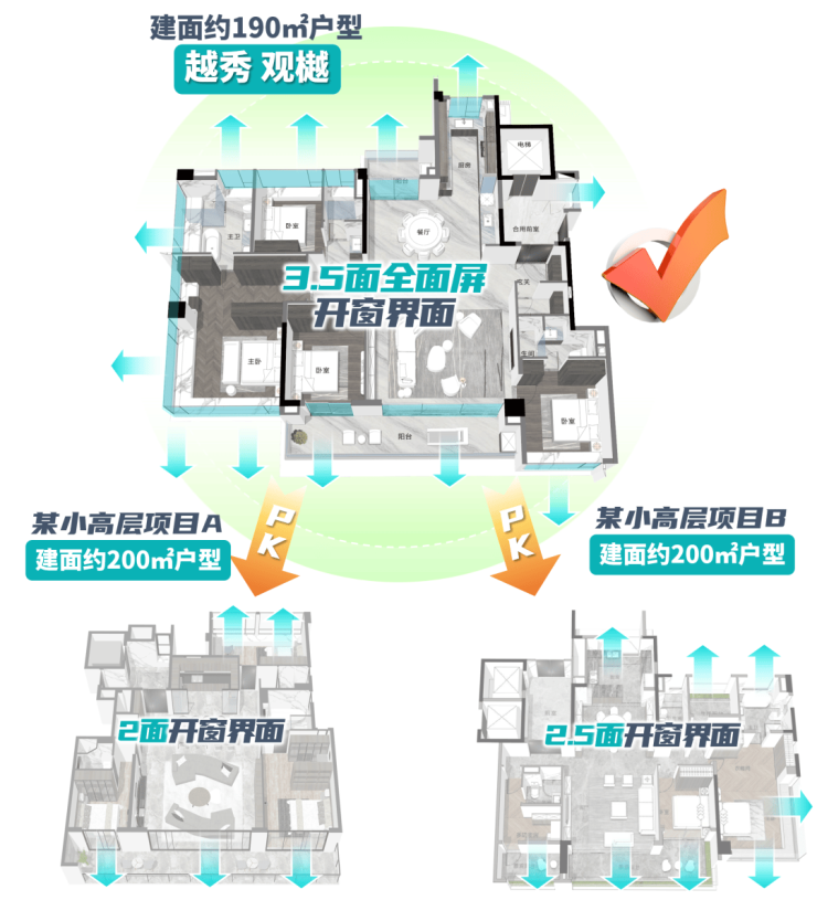 户型三开间朝南,为了获取更大面宽视野,项目还将全屋的窗地比做到38%。
