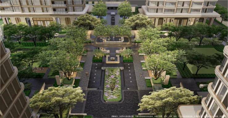 进入小区内,以一条约330米中轴园林,贯通南北双园,打造「三进五院」的归家礼序,中式对称美学处处可见。主入口高约10米、宽约56米,足够恢弘大气,放眼广州,仅此一家!