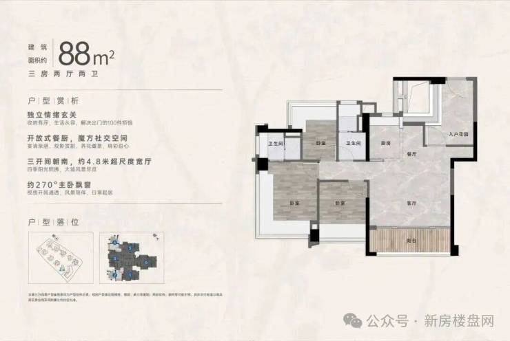 3️⃣ 【建面约88㎡南向三房】南向三开间