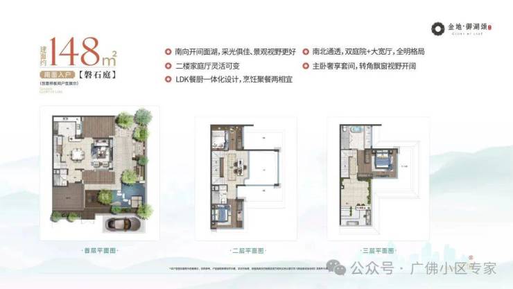 传统别墅产品营造的多以建筑为核心,而将室外庭院空间当做住宅的附属品,在这一点上,金地·御湖颂以前院后院设计,使单套建筑拥有更好的围合院落,赋予庭院的功能属性与空间私域感。三层L型围合建筑,三面高采光和高私密性、整体布局更加舒朗,景观视野更加开阔;各个功能空间以院子为核心,皆能享受到庭院景观;前后院的设计方式,使建筑有了“通透”感,目之所及皆透亮开阔,实现舒适与尊贵感并存。
