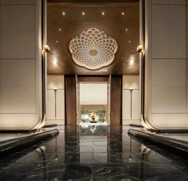对称仪式感的六扇瑞兽纹墙,庇佑业主归家。正前方约7.5 米高的气派铜门,由我国国宝级非遗大师朱炳仁先生锻造,一扇门融入了多种非遗铸铜工艺。