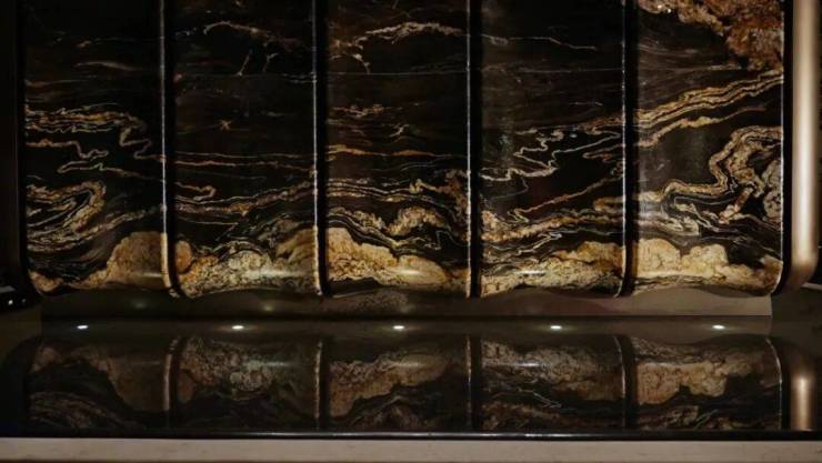 水庭底部由安哥拉黑奢石打造,两旁是六颗树龄近百年红果冬青树,正面是由宇宙黑金奢石打造的照壁,归家门面极富尊贵感。