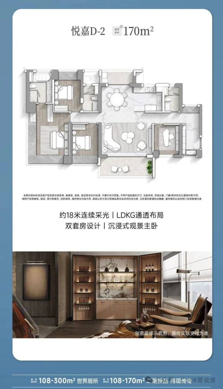 215㎡大平层,3梯3户,带超大入户前室,拥有约9.6米南向大景观阳台,和主卧270°观景飘窗,看园林景观。