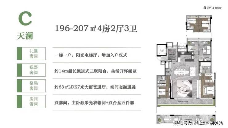 196-207平方米四房两厅三卫:尊享归家,约14米IMAX观景阳台,双主卧套房设计,7米超大会客厅,总价约1500万元起。