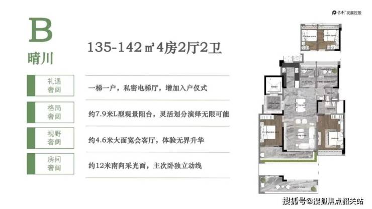 135-142平方米四房两厅两卫:超尺度阳台,约7.7米阳台连通次卧,岛台设计的半开放式厨房,总价约1100万元起。