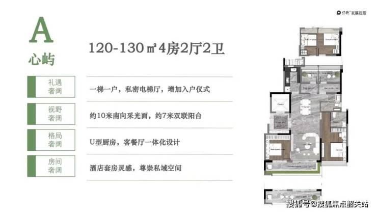 120-130平方米四房两厅两卫:奢阔视野,约7米双联观景阳台,私密专梯入户,LDK客餐厨一体化设计,总价约1000万元起。