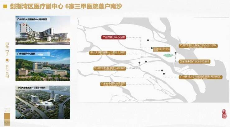 项目所在区域拥有6家三甲医院,广州市南沙中心医院,在建中的广州市妇女儿童医院、中山大学附属第一医院、广东省中医院、中山大学附属口腔医院、广州医科大学肿瘤医院,打造湾区医疗高地!