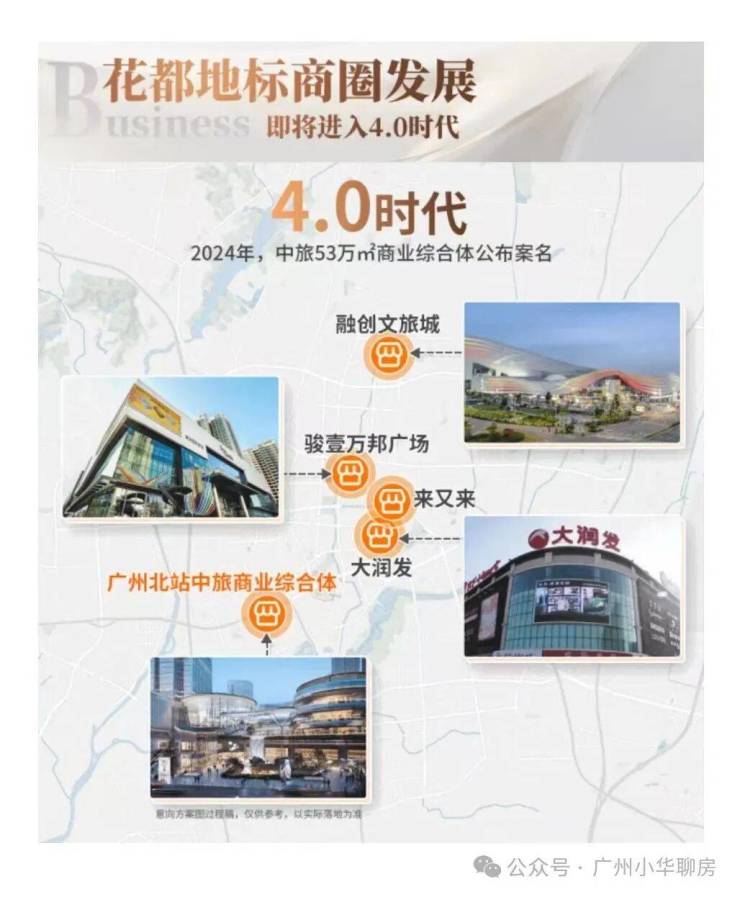 从2006年花都第一家大型商超大润发开业,到2010年来又来、骏壹万邦广场相继落成,到2019年文旅综合体融创文旅城的落地。其中心发展,同样以地标商圈的落成为核心驱动。