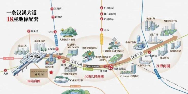 广州南站串联万博、长隆两大板块,以“超级枢纽+超级商圈”模式平移都市中心,南站8km范围聚集番禺70%的经济总量、70%的常住人口,拥有前沿的产业体系+集中的商业配套+宜居的生态资源+高效的通勤速度,是番禺最适合生活居住的组团,打造广州不可复制的“黄金动脉”。