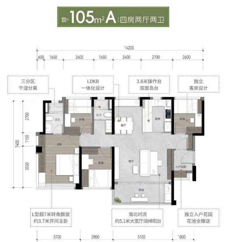 105㎡户型:南北对流大方厅,客厅面积可扩至23㎡,三代同堂无忧