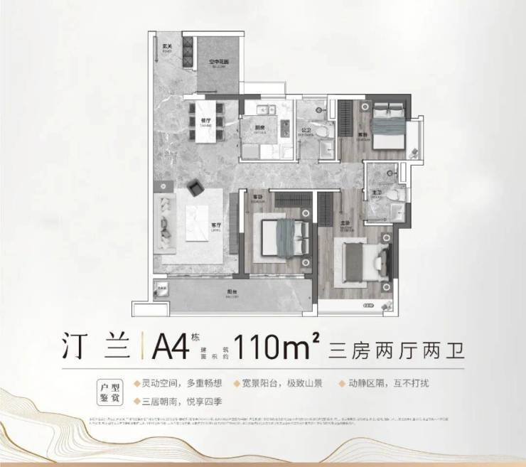 璟珑府涵盖建面约95-110㎡宽境洋房,建面约142-168㎡山景板楼和建面约206㎡空中墅,1.2低容积率,南向宽境舒居,采光更优,南北对流,清风穿堂而过,分外舒爽。观景大阳台,直面园林美景,满足三代同堂生活所需。