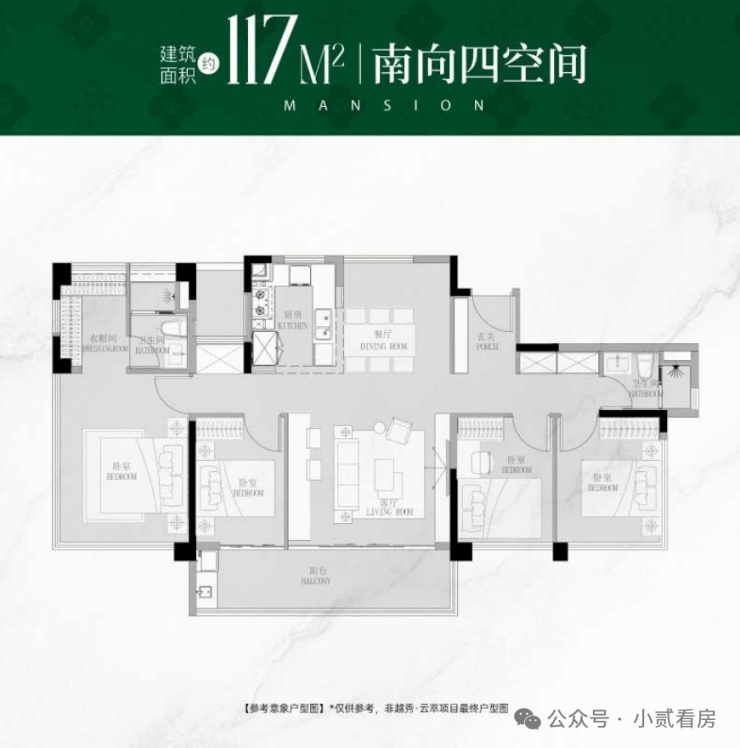 1、稀缺板楼,6栋楼中,有3栋是21层塔楼,另外3栋是12-13层的稀缺板楼,纯南向117㎡四房,2T2配置,货量仅76套。1楼还带100㎡花园+地下室