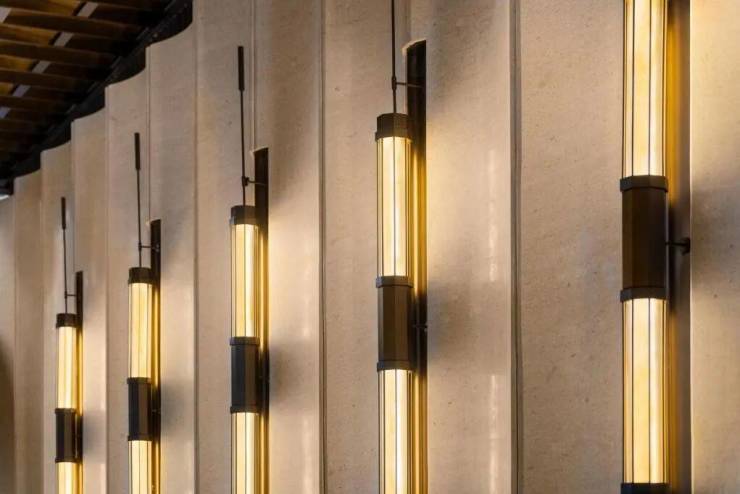 透过中空挂落,日光倾泻而入下方的“金石浮光”的艺术雕塑,阳光与金石肌理交织出细腻的纹理,低调奢华的氛围扑面而来。