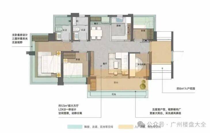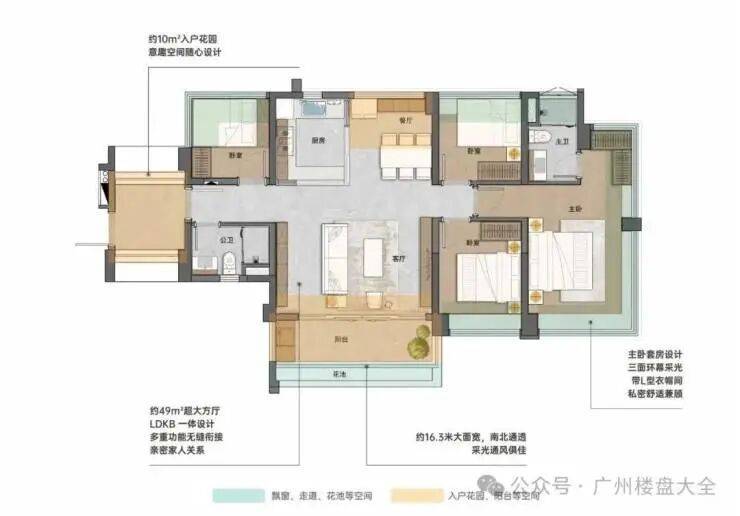 109㎡四房两厅两卫,五开间朝南,约16.3米大面宽,通风采光好,整个LDKB有49㎡,主套带L型衣帽间,三面环幕采光总价