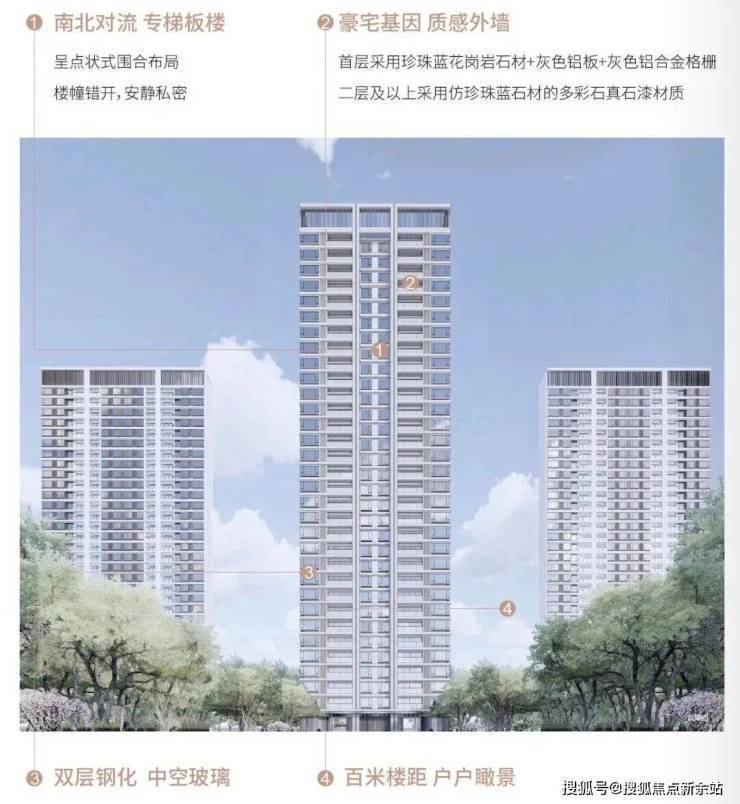 项目采用以深灰与浅灰为建筑主色调的现代简约建筑设计风格,注重居室空间的布局与使用功能的完美结合。外立面采用珍珠蓝仿石漆、水晶灰玻璃、深灰色涂料与深灰色金属百叶的搭配使用,保证建筑的耐久性、稳定性及自洁性,于严苛选材中凝练时光优雅。私密围合布局,一核,一轴,四组团,多节点,户型方正尺度舒适,全景观阳台,户内景观资源视野最大化,地上地下双归家礼仪备享尊崇,打造西区品质标杆。