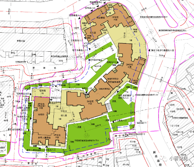 广州城投东园公馆占地面积仅为8470㎡,规划了4栋21-23层住宅,整体容积率高达5.8;其中,南端的4#住宅为回迁房,其余3栋则为商品房,均为塔楼设计。