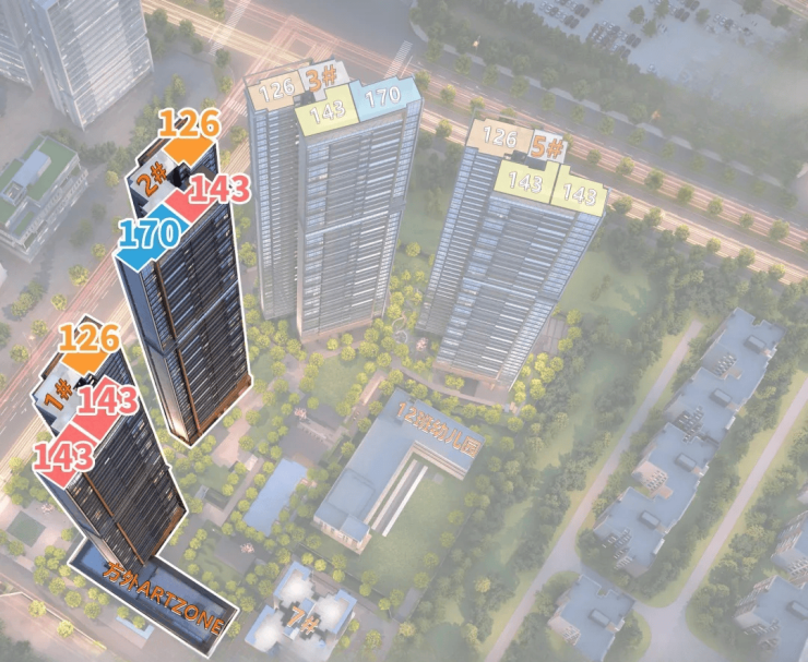 中海麓府仅4栋住宅,40多层高的住宅(1#高40层,2-3#高44层,5#高41层),两梯三户,底下规划有1所12班幼儿园+1栋自持物业,货量在500套上下,它的面积段有三种,分别是建面约126㎡三房、143㎡和170㎡的四房。