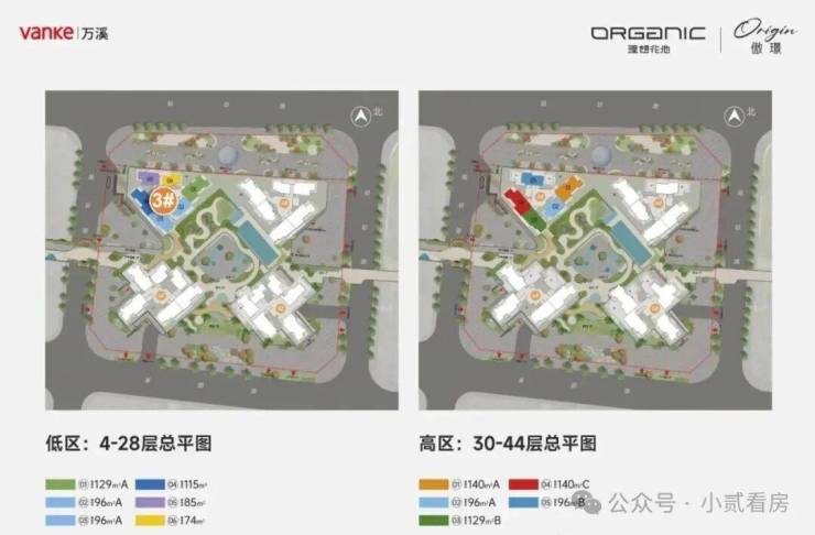3栋高低区设计,其中低区为4-28层,户型包括74-85-96-115-129㎡。