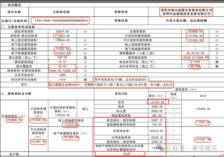 项目于近期做了规划调整,从公布资料可以看到,由于深圳“70/90”政策的退场,因而调整了户型,由之前的955户调整为763户。在总住宅建面不变的情况下,也就是户型更倾向于大户型。机动车充电桩停车位由605个调整至721个等。