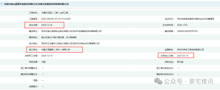 项目目前基坑工程正在进行中,合同开工日期 2024 年 12 月 15 日,竣工日期 2027 年 5 月 16 日,预计 2025 年下半年入市。