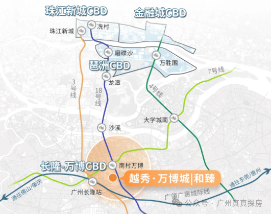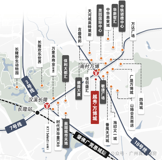 三地铁线、双地铁站的优势,距离地铁7号线和18号线的交汇站点南村万博站仅有约1.3千米,距离地铁7号线与3号线的交汇站点汉溪长隆站仅有约1000米,走路过去也是很便捷的。