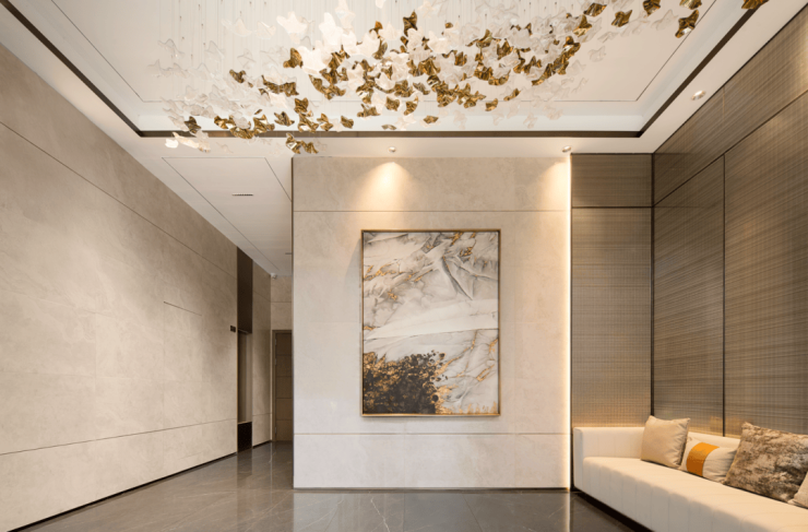 入户大堂,引入人脸识别系统,内部宽敞明亮,搭配高质感岩板、金属格栅和氛围灯,仪式感拉满。