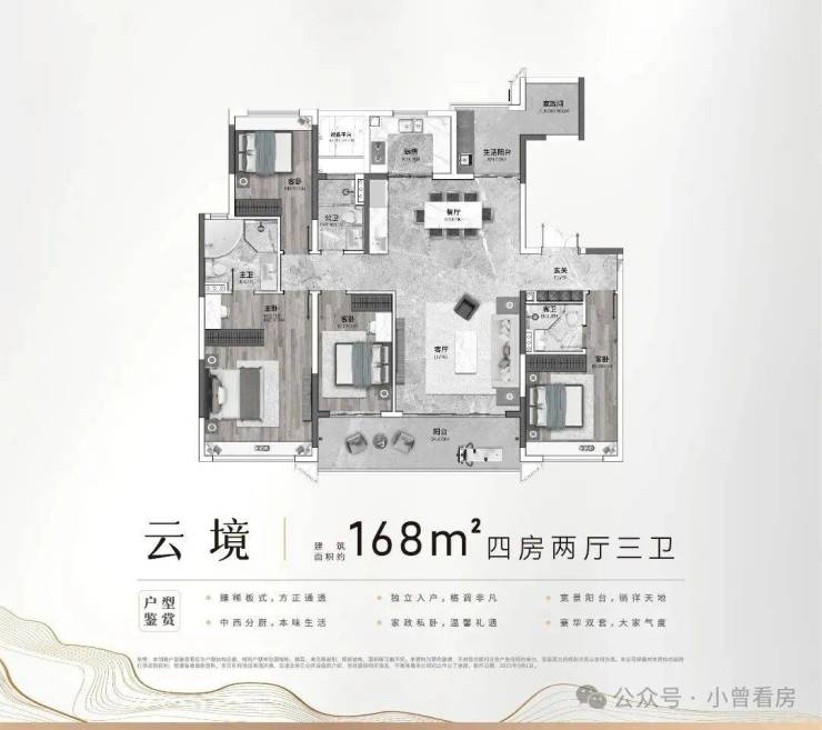 璟珑府主打91-168平,户型设计上,2梯2户、大开间、宽采光、功能聚合等都是亮点。