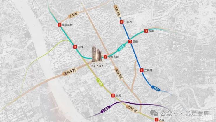 距离 8 号线宝岗大道站仅 150 米直线距离,广佛线沙园站约 700m,地铁 2 号线昌岗地铁站约1km。1站换乘广佛线,7站直达珠江新城。